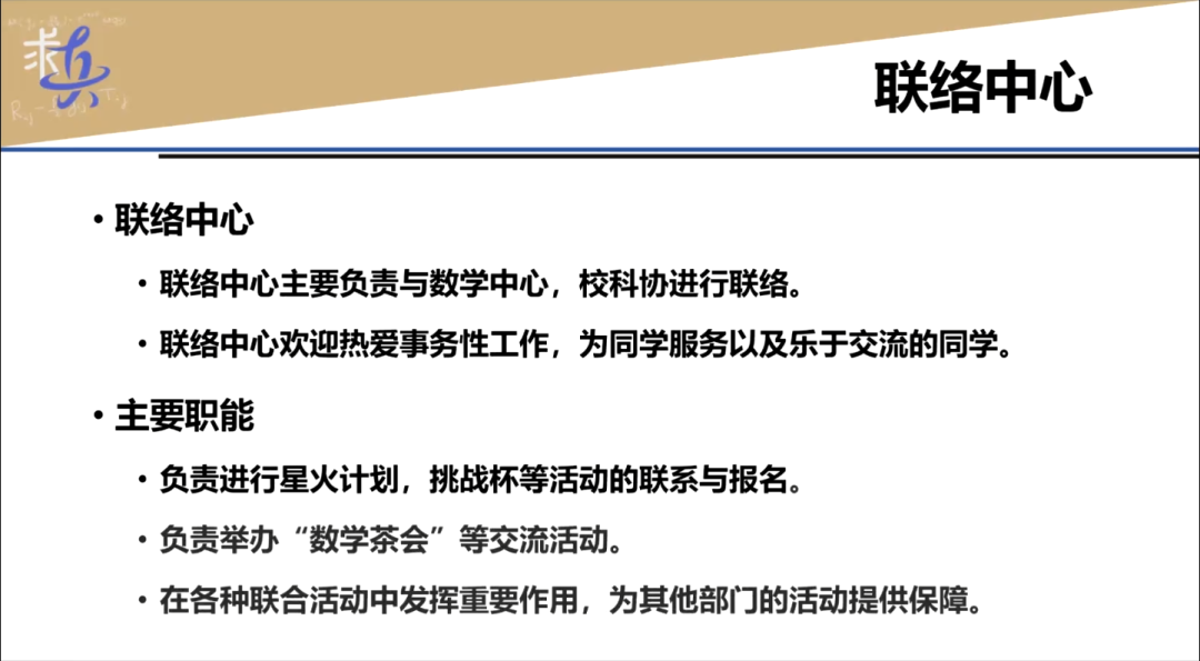 主要工作:联络中心主要负责与数学中心,校科协进行联络。