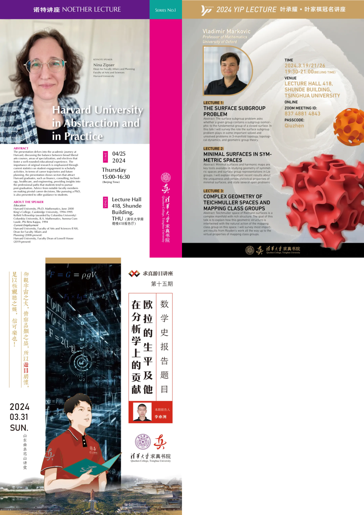 持续组织“数学史”、“ 科学史”、“求真大讲堂”、“叶承耀·叶家祺冠名讲座”、“诺特讲座”和“求真游目”系列讲座,数语真心沙龙,曲阜数学大师对话等。