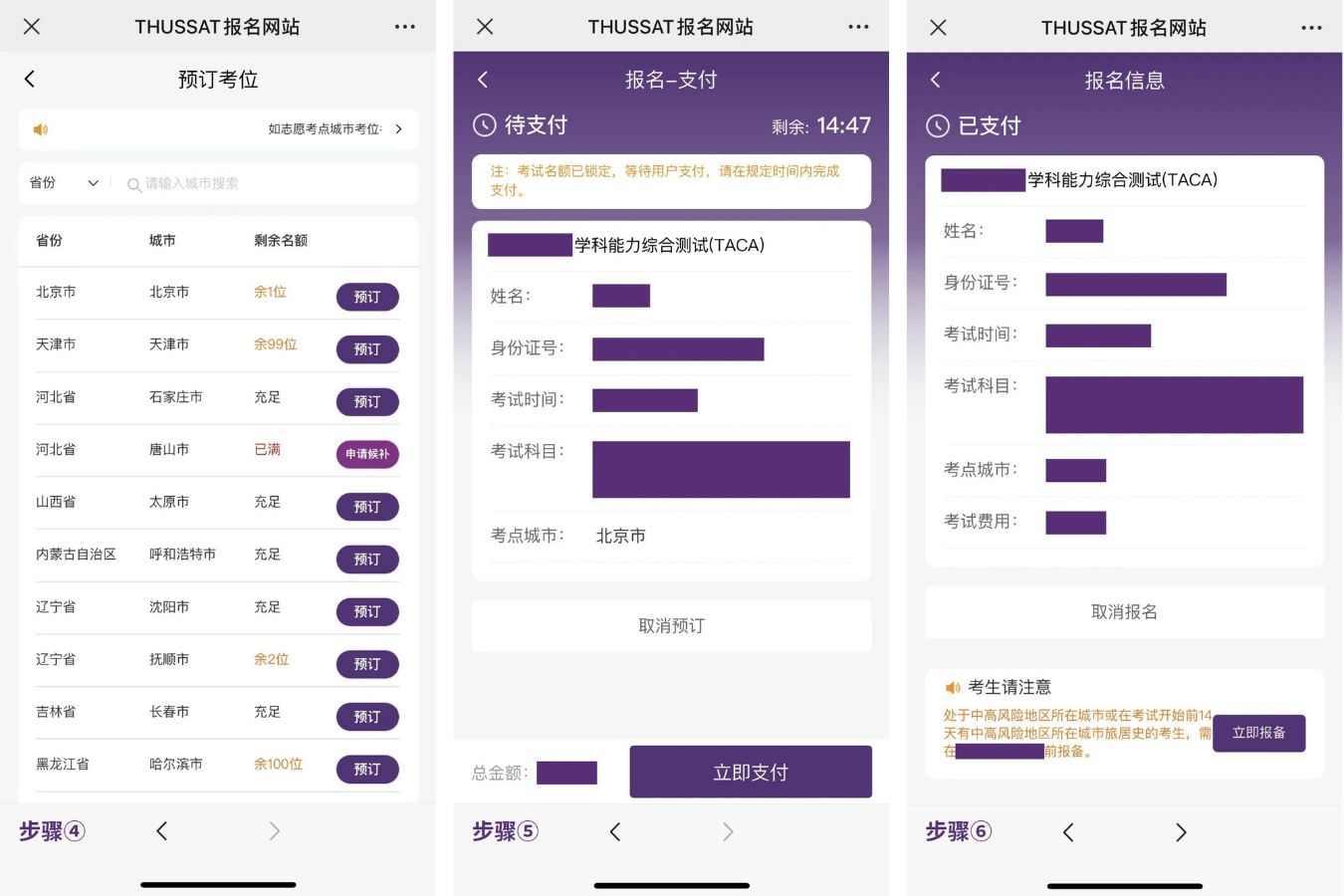 步骤⑤ ,点击【立即支付】完成考位预订。若更换考位城市,在支付报名费用前,点击【取消预订】即可返回上一步重新预订;