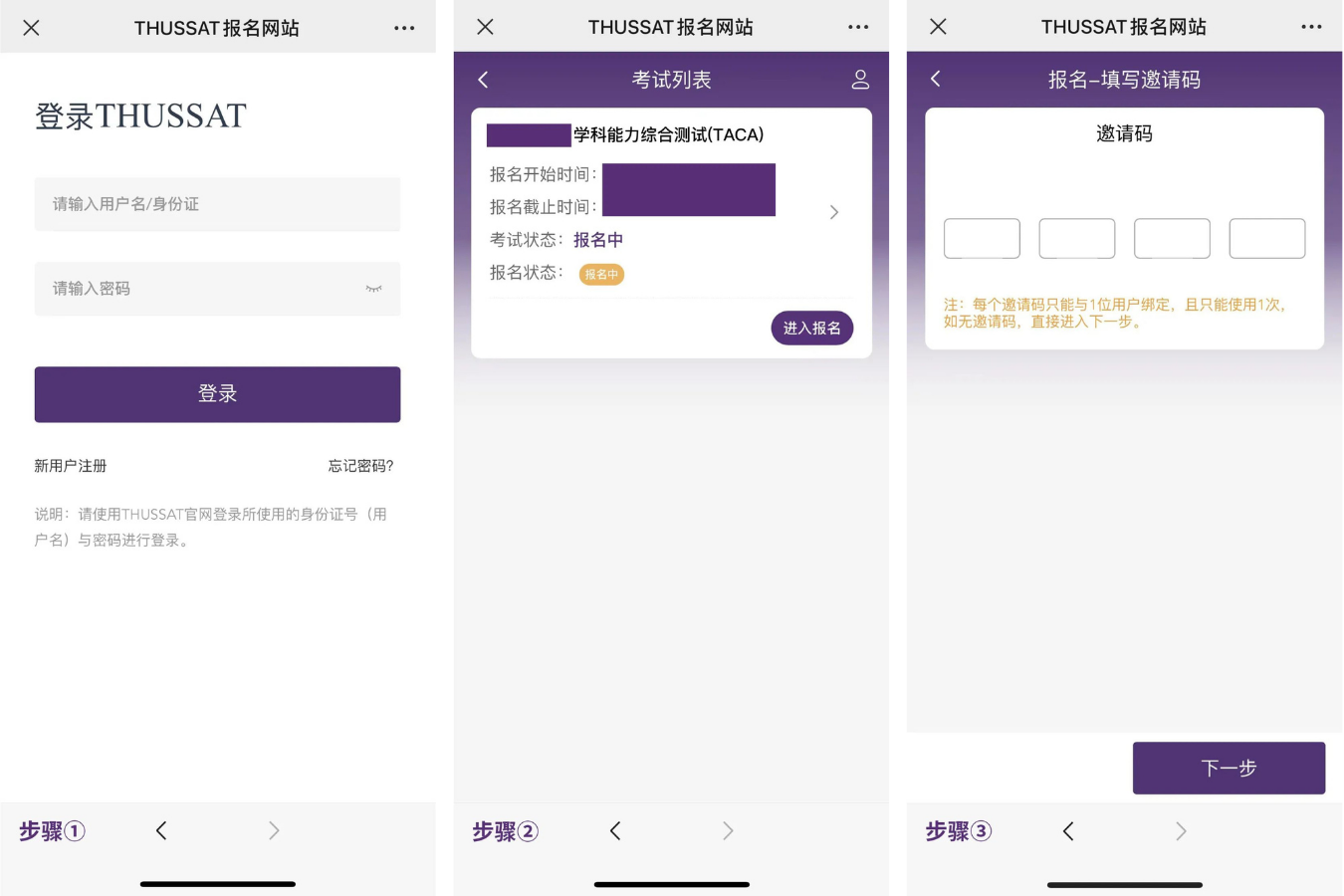 方式二:电脑端打开报名网站(www.thussat.com),输入已注册的账号及密码查看考试列表,完成考点城市预订和考试报名。