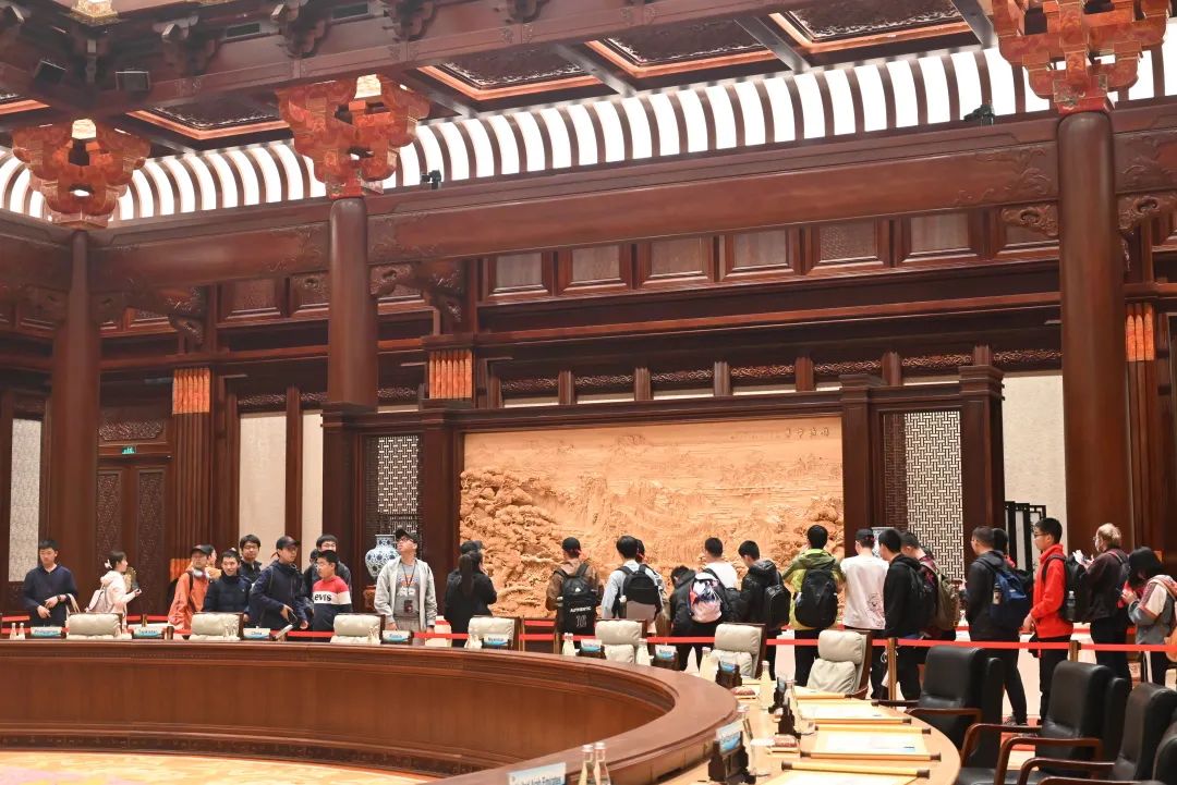雁栖湖国际会议中心是第二十二次APEC领导人峰会以及两届“一带一路”国际合作高峰论坛圆桌峰会的举办地,其以“鸿雁展翼,汉唐飞扬”为设计理念,体现着开放与融合、对话与沟通的深刻内涵,是举办国际高端政经会议的核心舞台。书院师生参观了集贤厅,其精致典雅、气势宏伟的建筑与装潢处处体现着中华民族热情好客、以和为贵的文化思想。