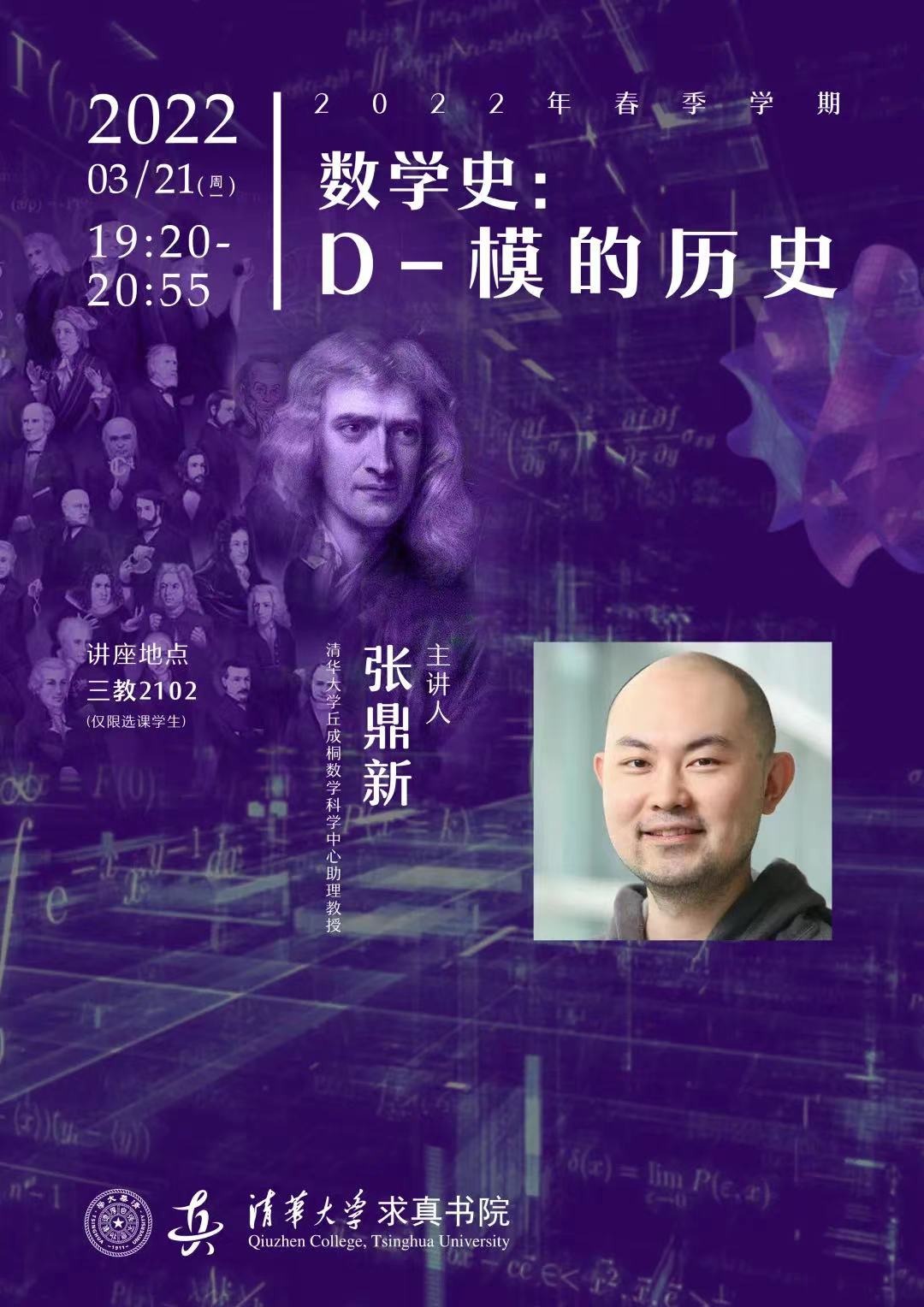 D-模理论是 "线性偏微分方程的代数理论",又叫 "代数分析"。它由佐藤幹夫学派 (特别是柏原正树, 河合隆裕) 所创建发展 (Bernstein 和 Beilinson 亦独立发展了代数簇上的平行理论), 在许多数学领域有广泛应用。本次讲座将介绍 D-模理论的 "史前故事",佐藤幹夫的一些独创思想,D-模的定义,以及 Grothendieck 的 "晶体" 观点等等。如果时间允许,我们会介绍一些更晚近的标志性事件,如 Bernstein 对 Gelfand 问题的解,柏原正树 (以及 Mebkhout) 对 "Riemann--Hilbert 对应" 的证明,斋藤盛彦的 "Hodge 模" 的理论的建立等等。