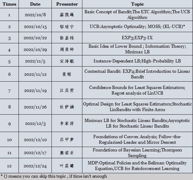 [S]. Slivkins, Aleksandrs. "Introduction to multi-armed bandits." Foundations and Trends® in Machine Learning 12.1-2 (2019): 1-286.(//arxiv.org/abs/1904.07272)