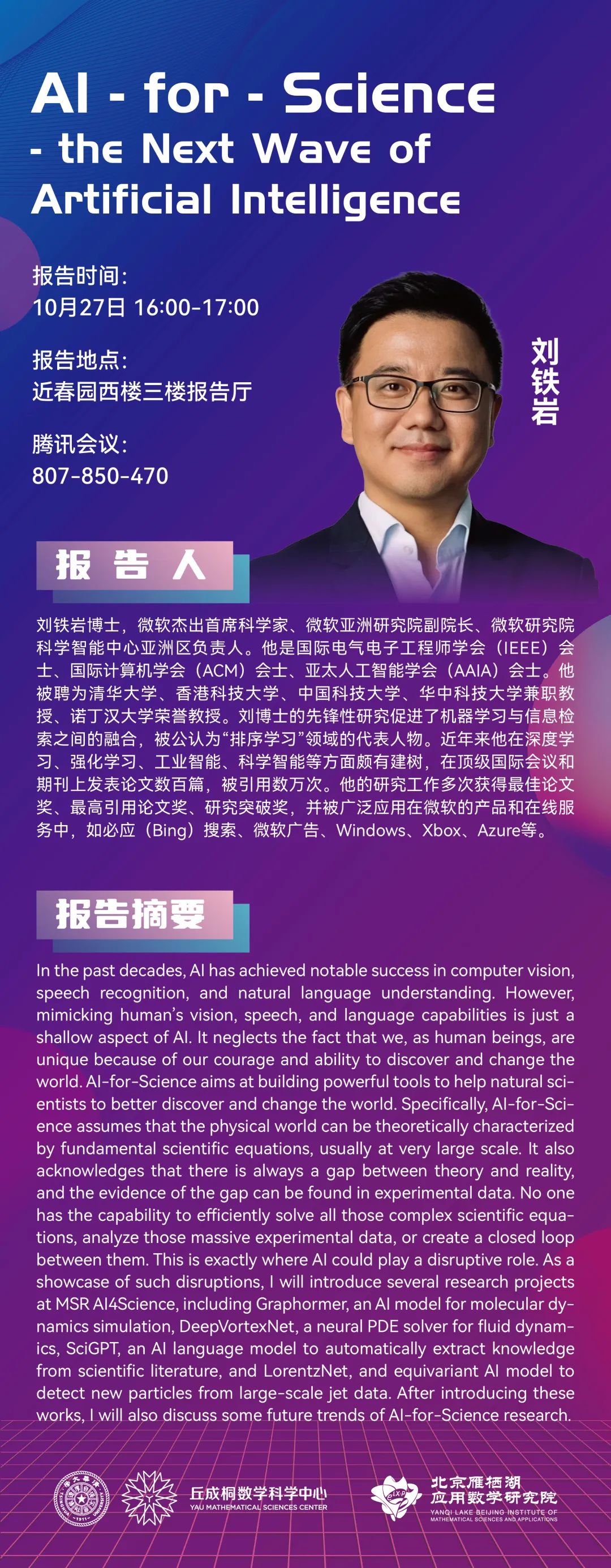 主讲人:刘铁岩时间:11月16日(周日)15:30地点:宁斋直播:校内【荷塘雨课堂】主讲人介绍刘铁岩教授(Prof.Tie-Yan Liu),现任北京中关村学院党委书记、院长,中关村人工智能研究院理事长,北京少年人工智能学院院长;曾任微软亚洲研究院副院长、微软科学智能研究院首席科学家。他(曾)被聘为卡内基梅隆大学(CMU)、18porn 、中国科技大学、华中科技大学等多所大学的兼职教授,诺丁汉大学荣誉教授。他是国际知名的人工智...