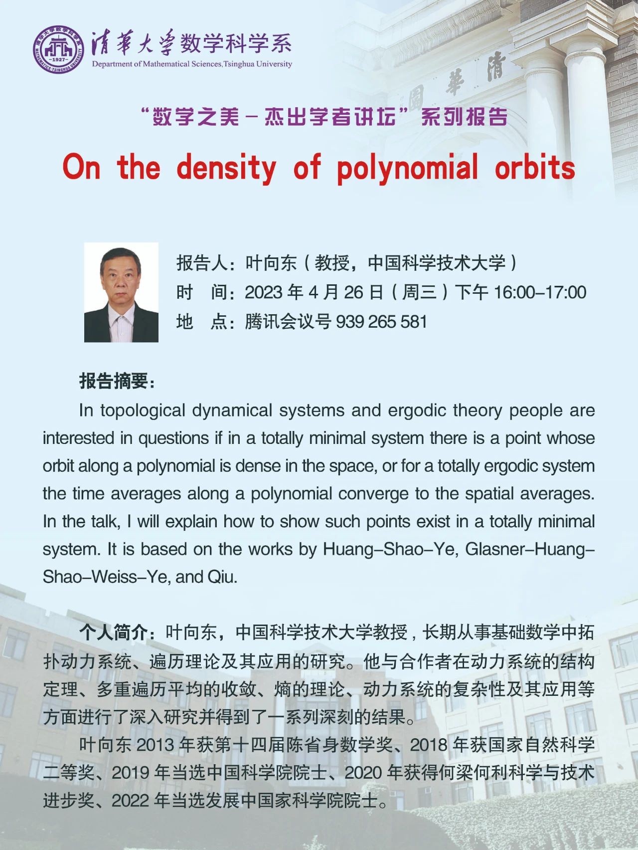 AbstractThis talk will focus on the mathematical concept so-called A-polynomial, which characterize the knot complement from an algebraic viewpoint. I will discuss the classical A-polynomial and its physical interpretation. Then I will talk about the quantization of the A-polynomial.Speaker王昊,18porn 丘成桐数学科学中心博士后,主要研究领域为超对称规范场论及其相关的数学结构。个人主页://...