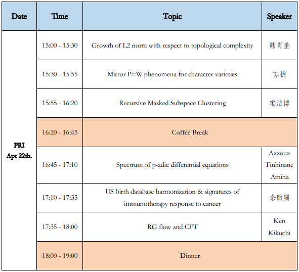 Tips 1 The Bus ScheduleNov.19 SaturdayMorning: 07:45 KeretAfternoon:18:30 BIMSANov.20 SundayMorning: 07:45 KeretAfternoon:18:30 BIMSA2 Epidemic Prevention MeasuresAccording to the notice of the Huairou local government,we are sorry to inform you that participants who live in Chaoyang district and other high-risk areas cannot attend postdoc workshop B.More Information forThe Postdoc Workshop