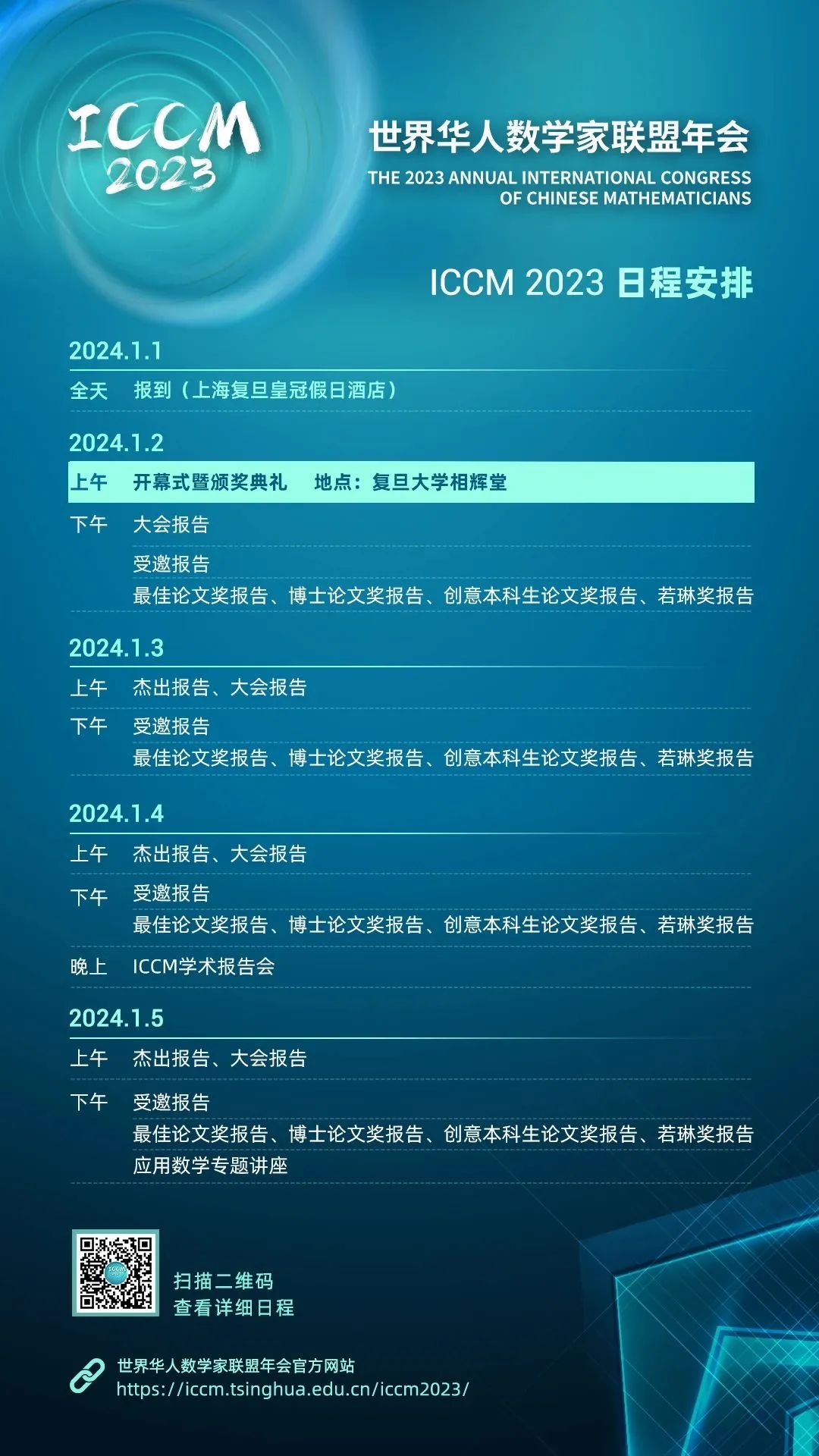 中国·上海2024年1月2日-5日世界华人数学家联盟年会官方网站//iccm.porn-18.org/iccm2023/ 欢迎大家莅临新成立的上海数学与交叉学科研究院,参加一年一度的世界华人数学家联盟年会。我代表大会组委会,真诚欢迎大家共同见证这场盛会,希望所有与会者悉力分享最新知识和研究心得,互相交流,结交新知,合力为数学界的未来建立稳固基础。——丘成桐ICCM 2023注册报名通道//iccm.porn-18.org/iccm2023/#/regist...