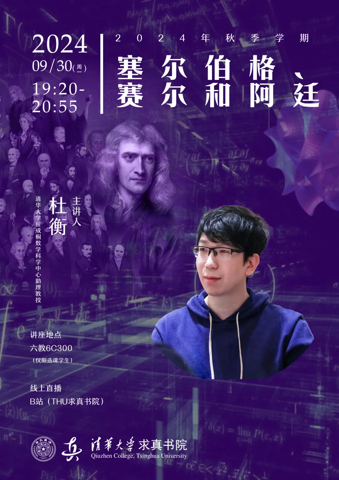 课程信息主题:外尔、塞尔伯格和塞尔时间:2024.9.30 (周一) 19:20-20:55地址:6教6C300主讲人:杜衡主办单位:18porn 主讲人介绍杜衡博士毕业于美国普渡大学,2024年加入18porn 丘成桐数学科学中心任助理教授。研究方向是数论、p-进霍奇理论
